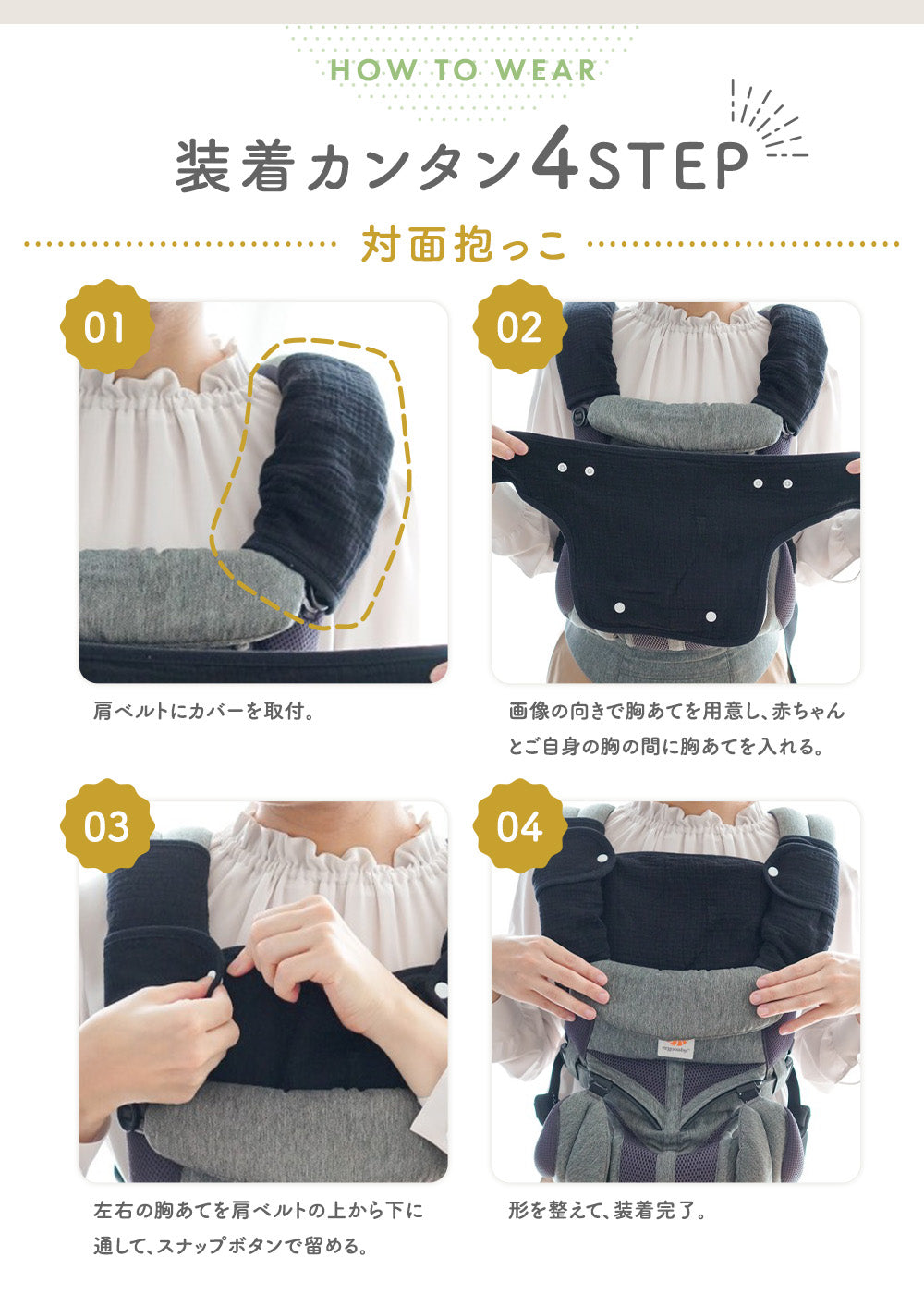 ・胸当てよだれパットは対面抱っこでも前向き抱っこでもどちらでもお使いいただけます。