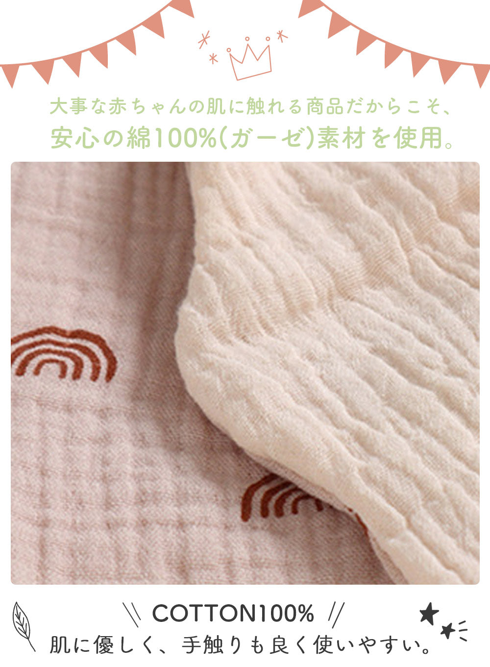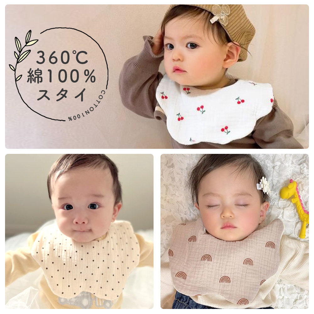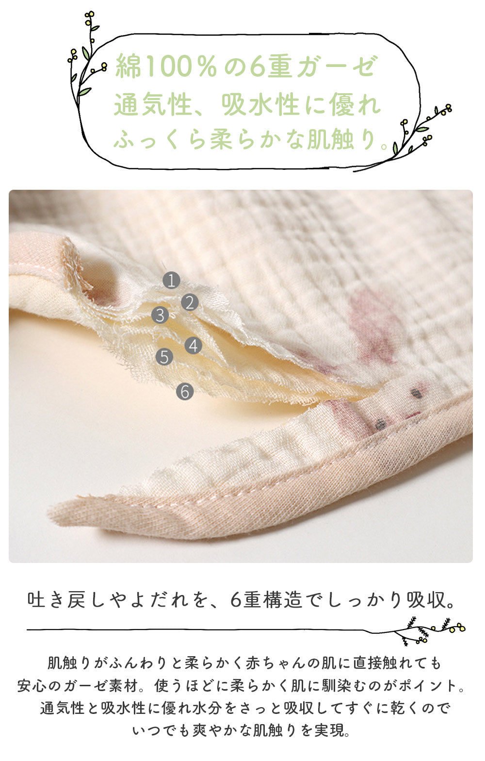 ・6重構造で汚れやよだれなどを吸収するスタイ、吸水性に優れたガーゼ素材。
