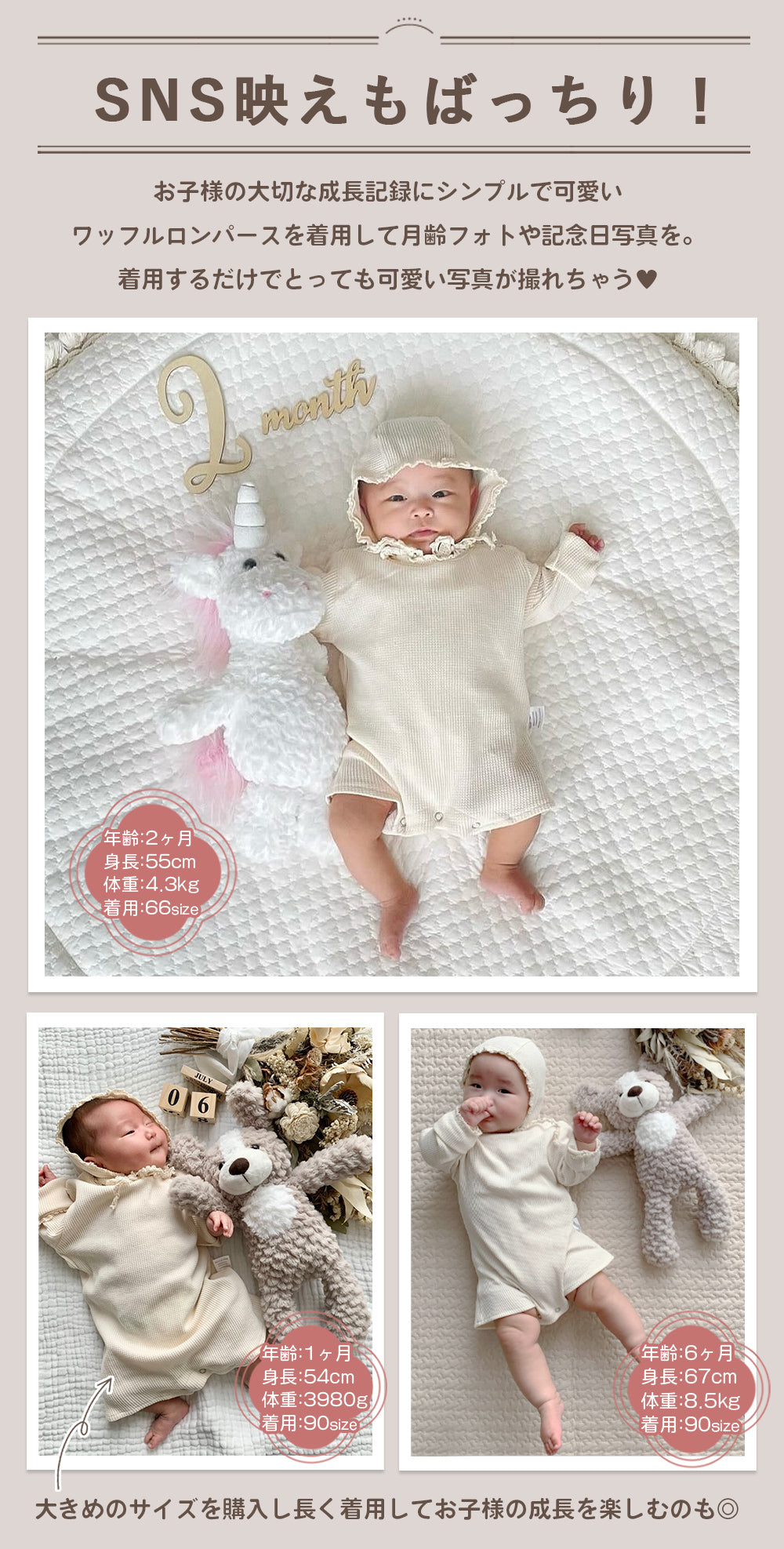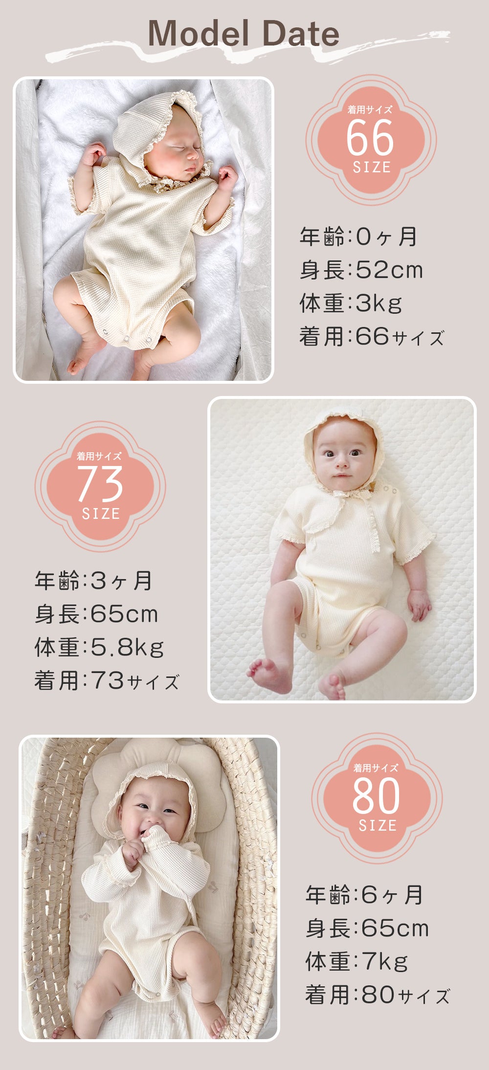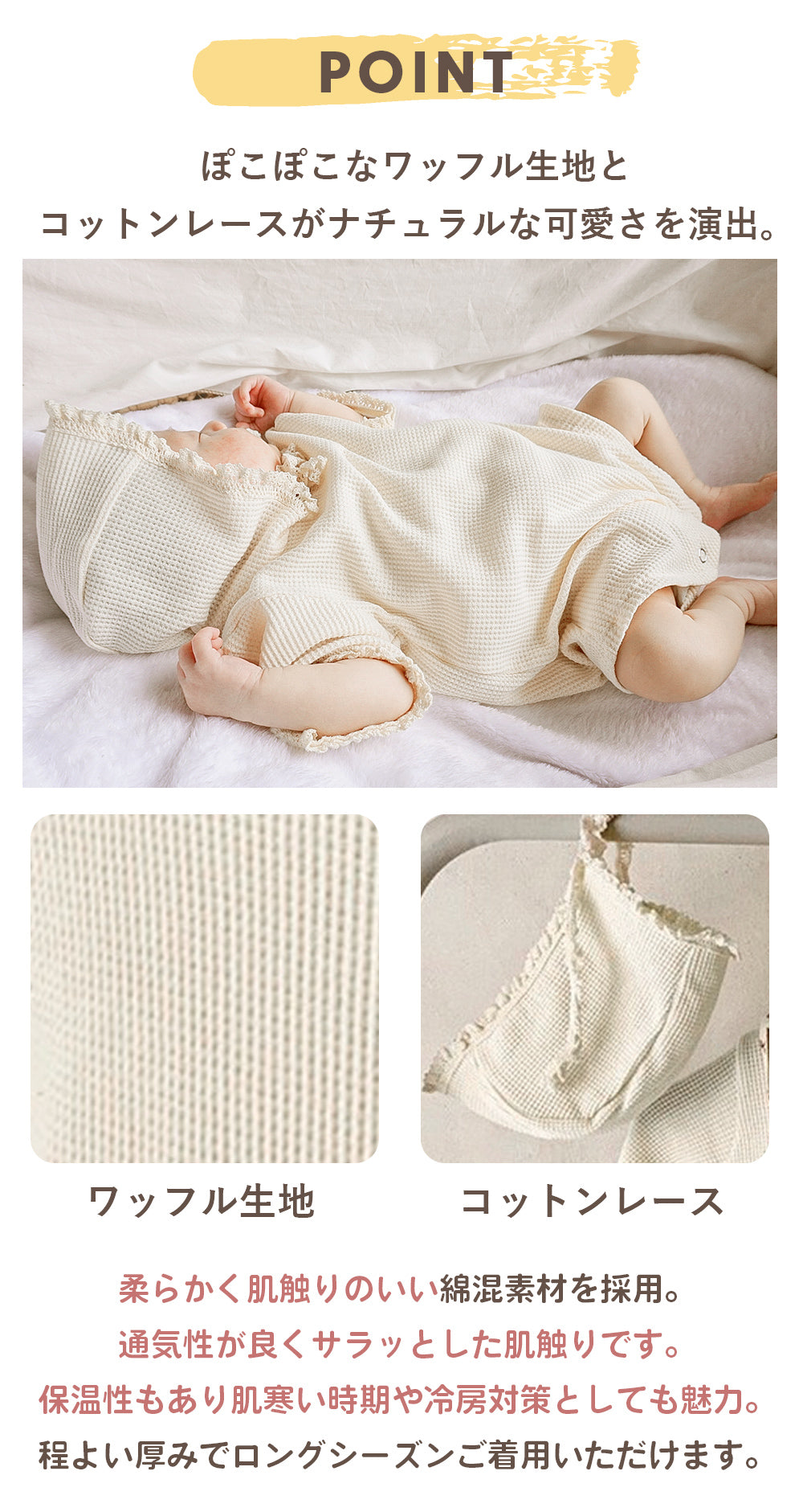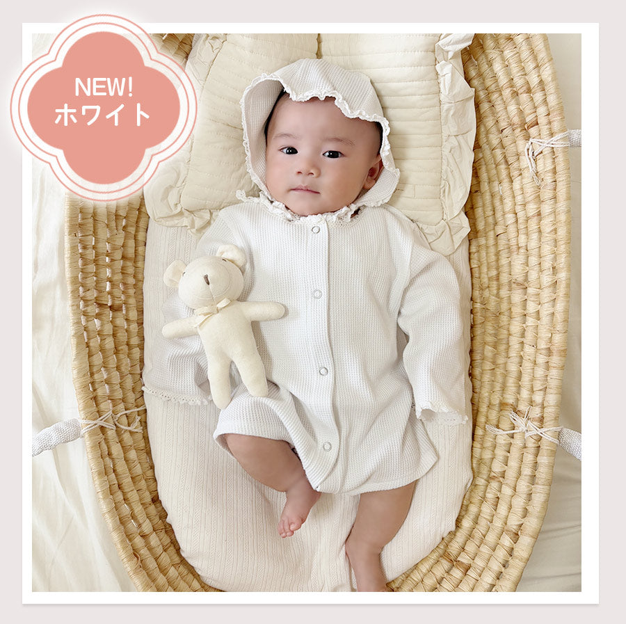 ・肌触りの良いワッフル生地のボンネット付きベビーロンパース