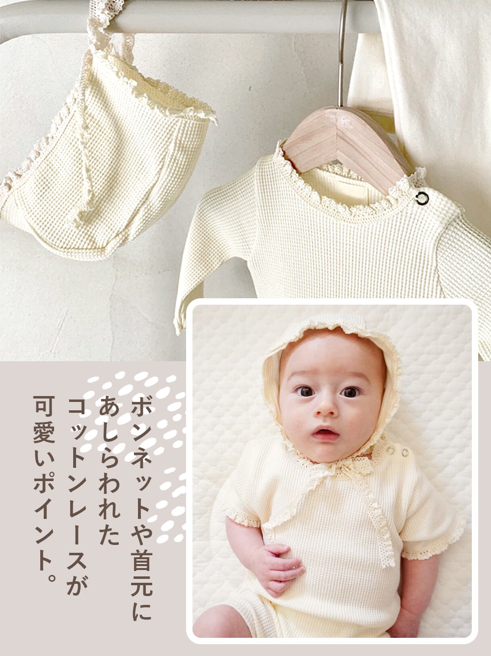 ・ボンネットや首元にあしらわれたコットンレースが可愛いポイント