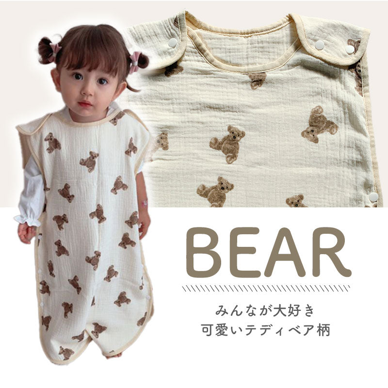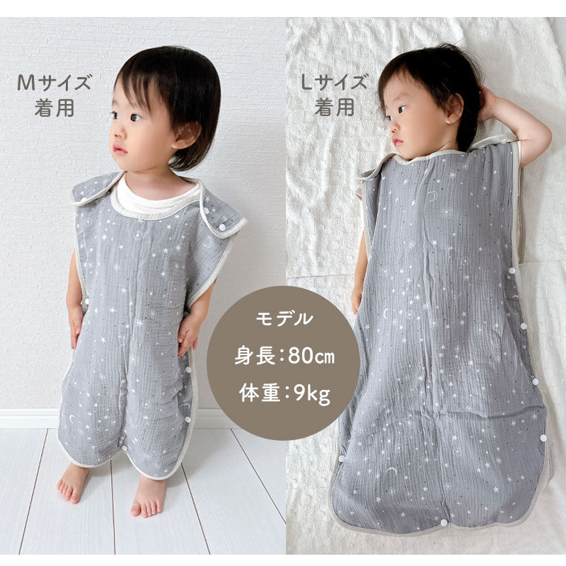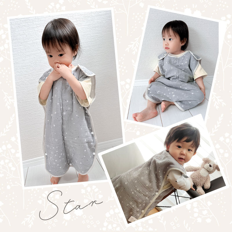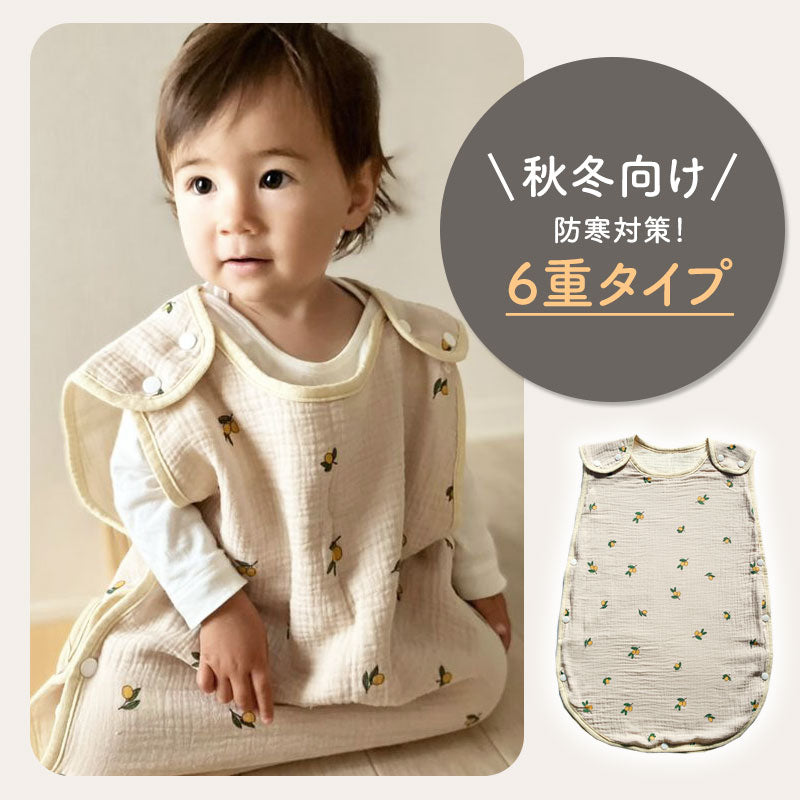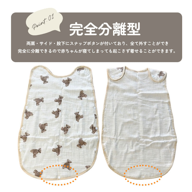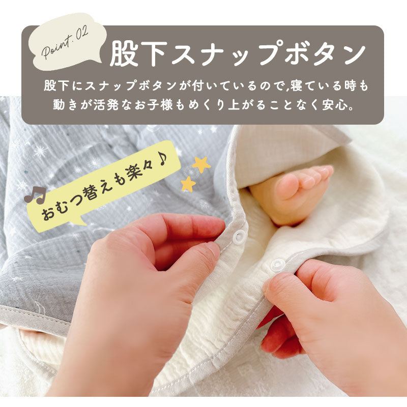 ・デリケートなお子さんの肌にも優しい綿100%のガーゼを6重に重ねたガーゼスリーパー。寝冷えなどが気になるお子さんにピッタリなアイテム!程よい厚みで1年中ご使用頂けます。