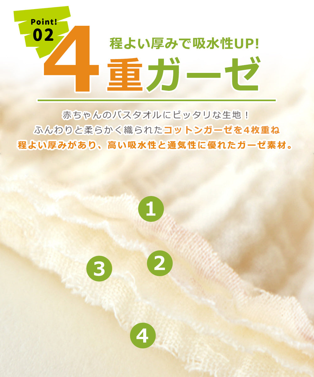 ・コットン100%で織られた4重ガーゼはふんわり柔らかい肌触り。赤ちゃんのデリケートなお肌へでも安心してお使いいただけます。