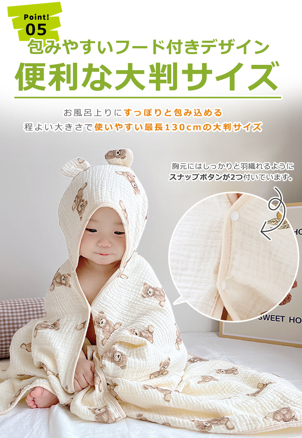 ・バスタオルだけでなく、おくるみ、ブランケットなどとして、プールや海など様々な場面でお使いいただけます。