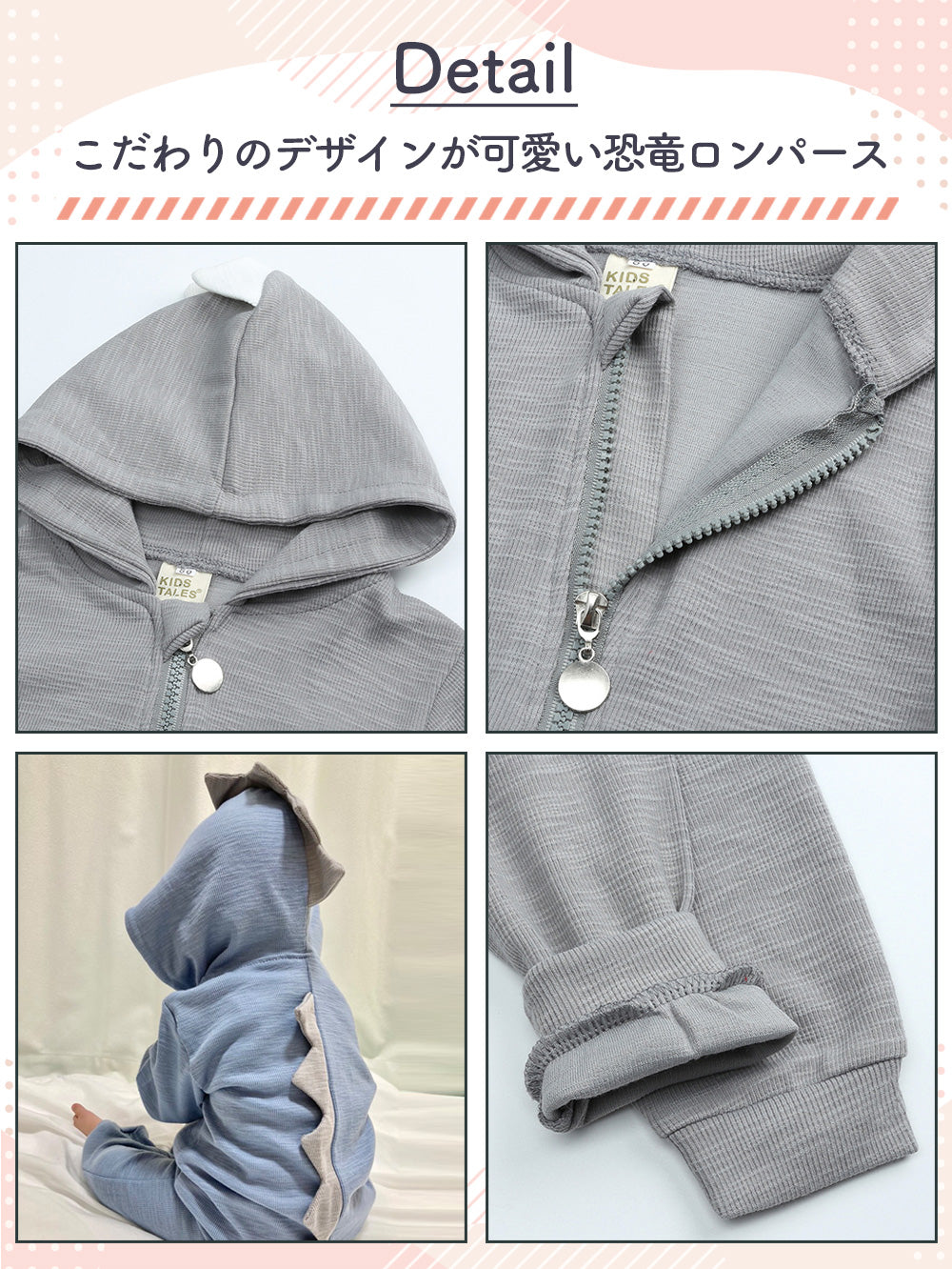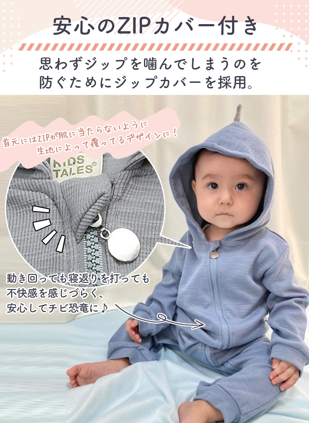 ・首元にはZIPが肌に当たらないように生地が覆っているデザインなので赤ちゃんに安心◎