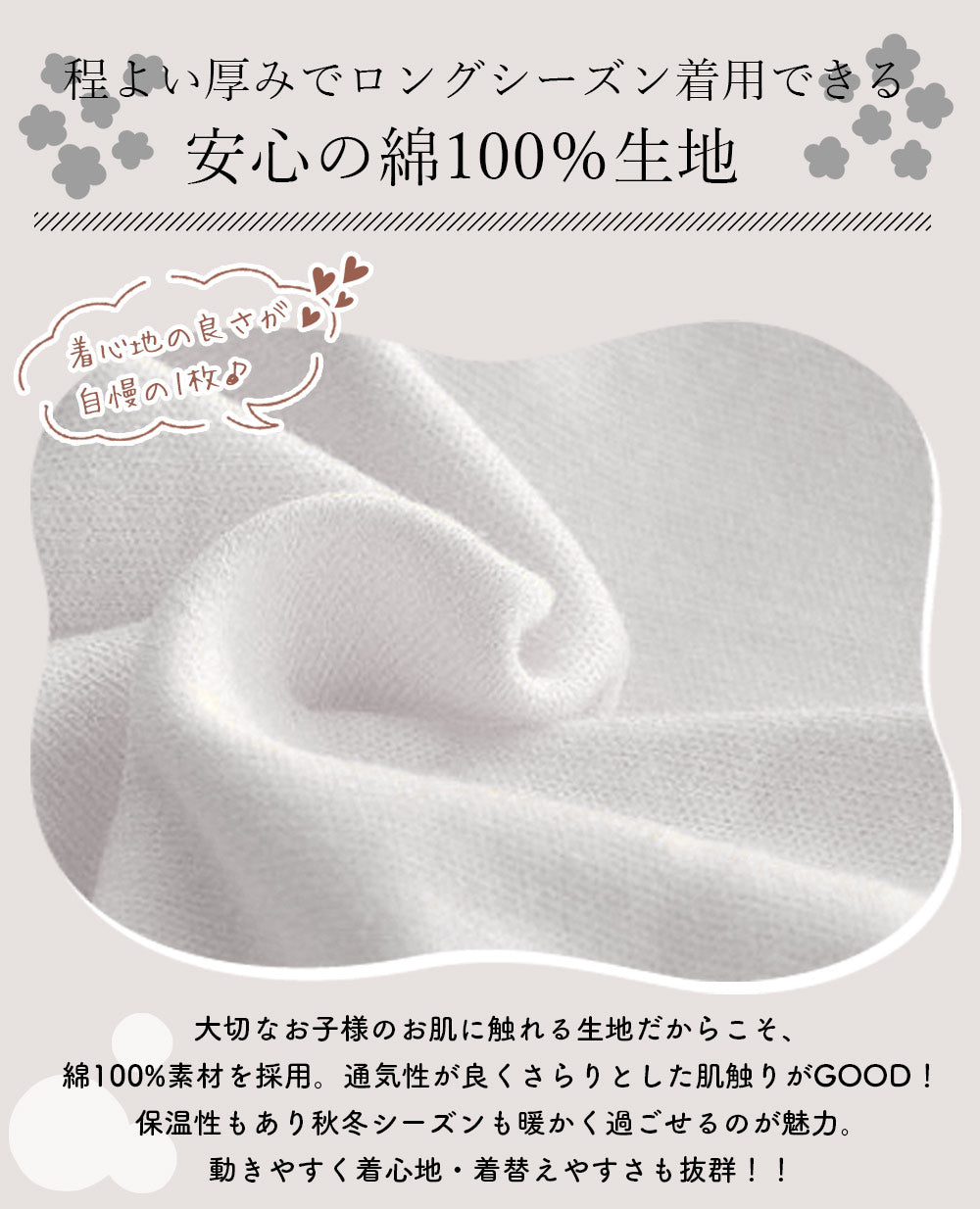 ・赤ちゃんに優しいコットン100%素材で通気性もよくサラリとした肌触り。程よい厚みでロングシーズン着用できます。