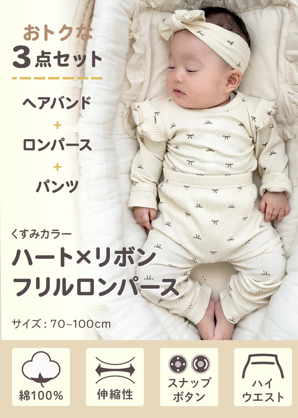 ・長袖ロンパースとズボンとヘアバンドのオトクな3点セットです。