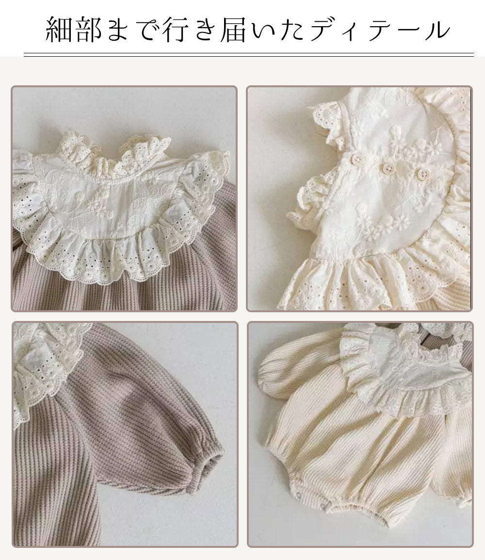 ・ワッフル生地とフリル×レース刺繍が可愛いロンパース♪