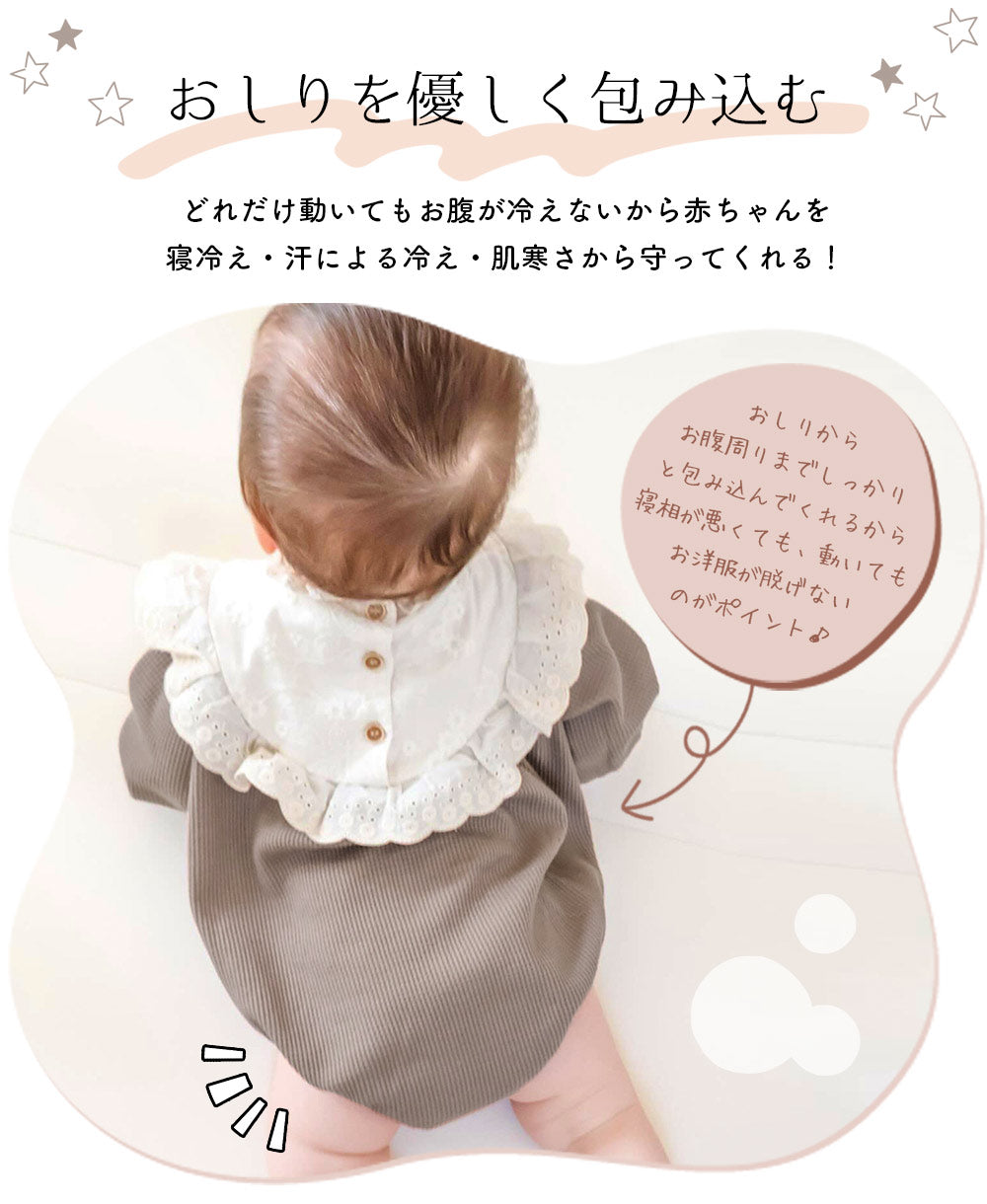 ・股部分はスナップボタン付きでおむつ替えも楽々できます。