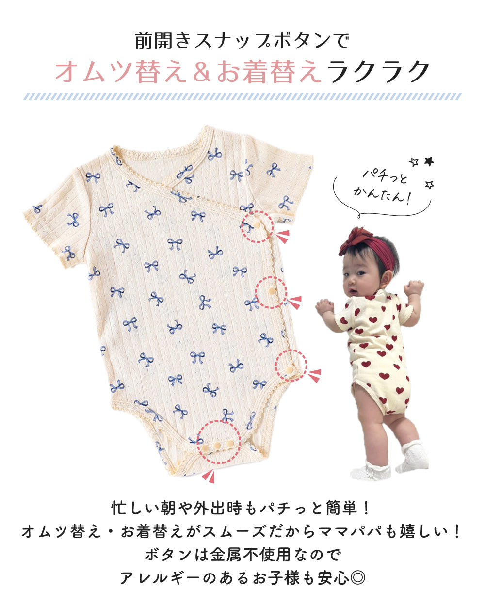 ・股部分もスナップボタンだからオムツ替えが楽ちんなのもママに嬉しいポイント♪