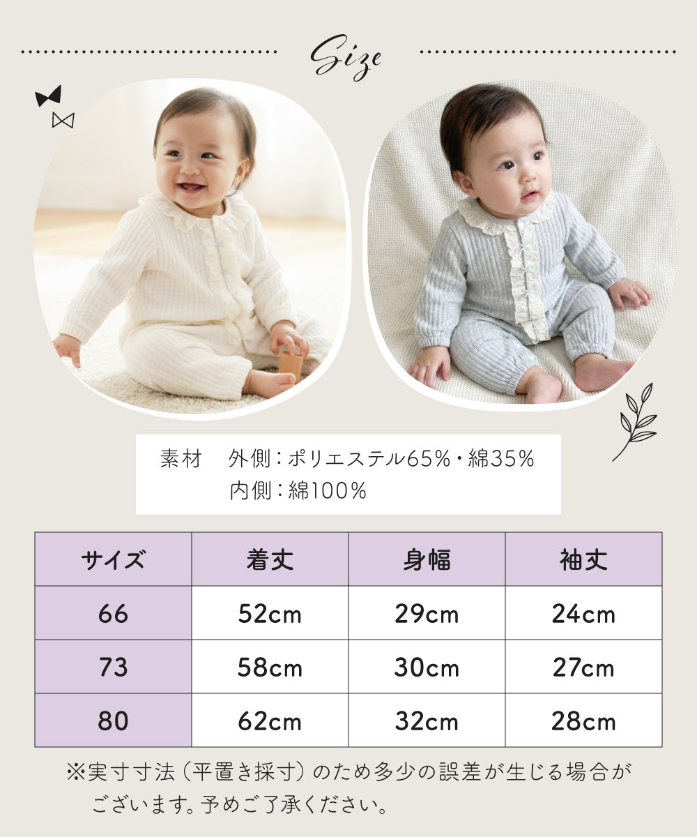 ・袖口、足口はゴム入りで、動いてもずれにくく、ふんわりフィット